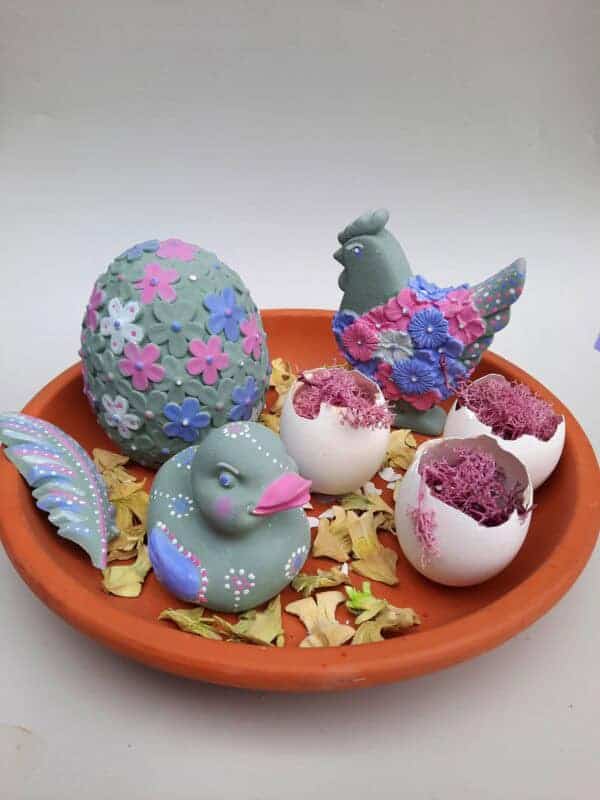 De decoratiefiguren (ei met bloemetjesmotief, veer, eendje en de kip) zijn zelf gemaakt.
