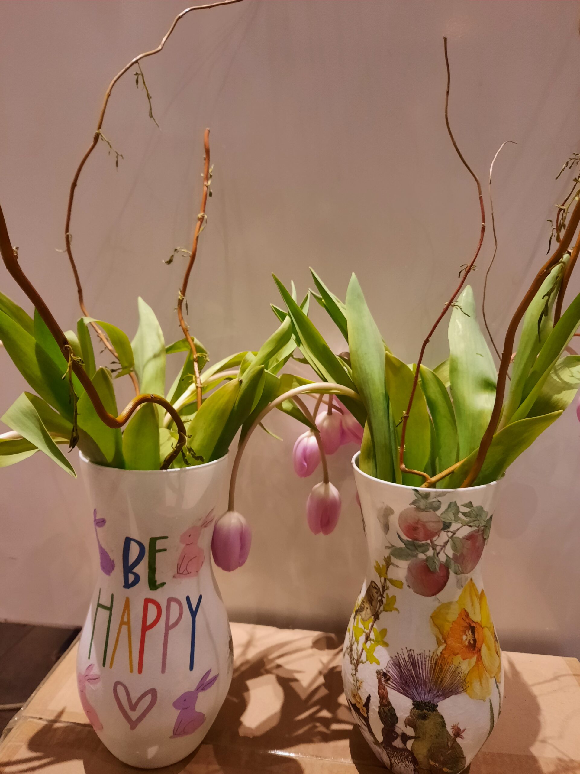 Er is volop keuze in de maten van de vazen en in de printjes van de servetten.