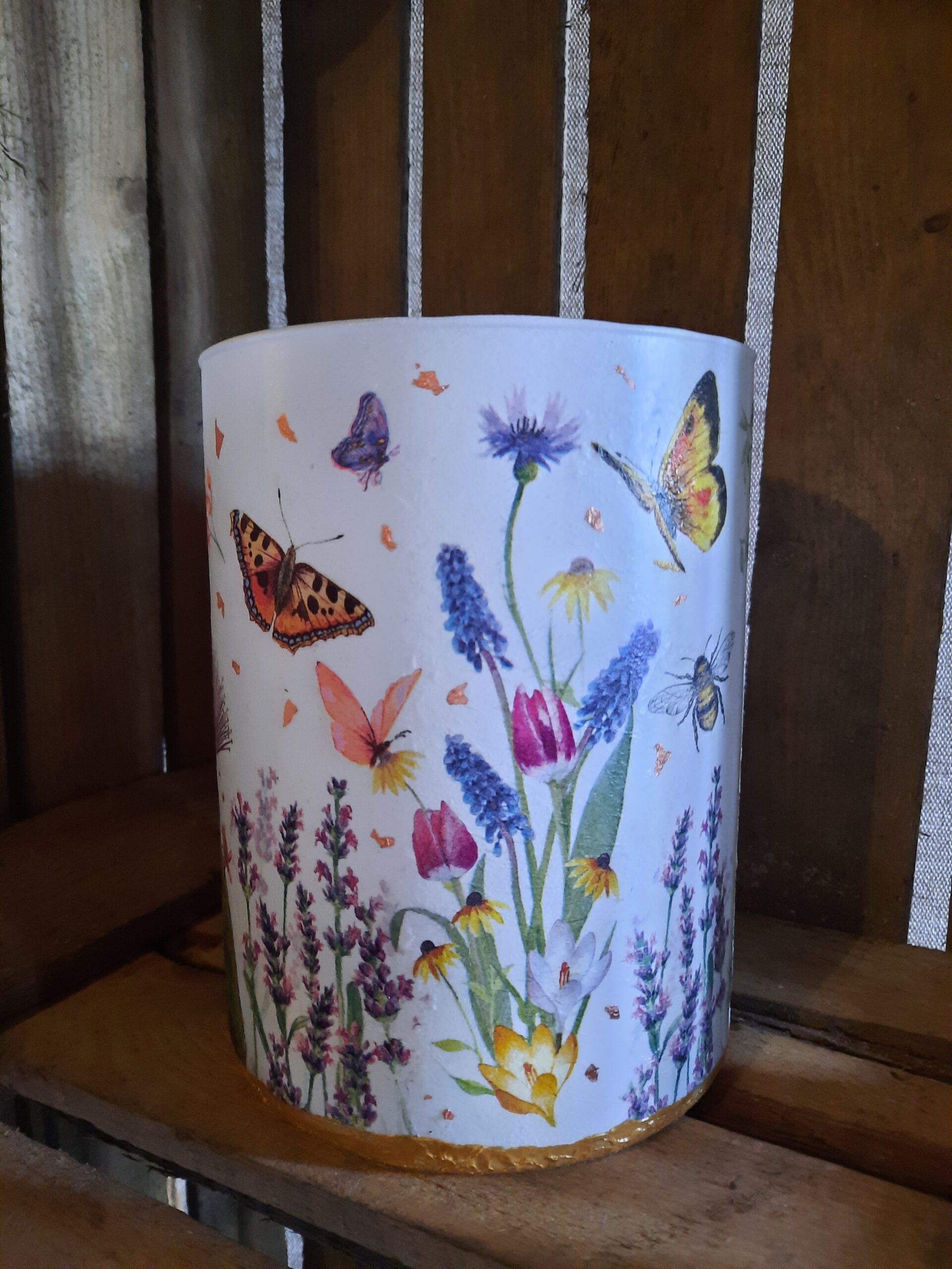Tijdens deze workshop gaan we aan de slag met de decoupage techniek. Decoupage wil eigen zeggen dat je uitgeknipte / uitgescheurde servetten bewerkt op een ondergrond. De witte vaas wordt aan de buitenzijde bewerkt met de decoupage techniek (servet), dus je kan hier water of een kaars in doen, deze laatste geeft een heel mooi effect! Naderhand brengen we nog wat koper en goud vlokken aan op de vaas zodat deze wordt omgetoverd tot een uniek exemplaar.