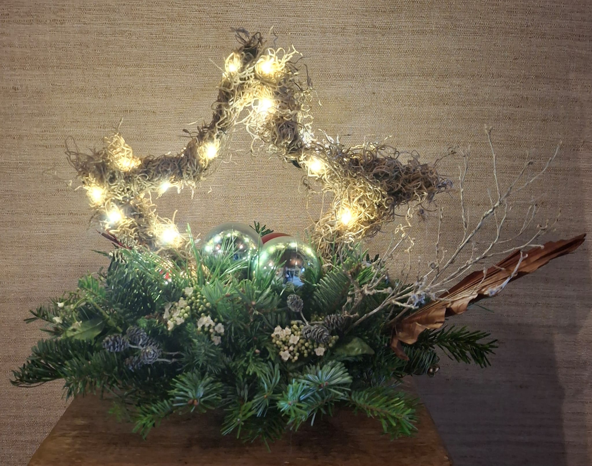 Vervolgens begint de uitleg van deze kerstworkshop. Eerst wordt de ster gedecoreerd met natuurlijk materiaal en daar worden de lampjes omheen gewikkeld. Vervolgens wordt de ondergrond met kerstgroen en decoratiemateriaal opgemaakt tot een superleuk kerststuk.