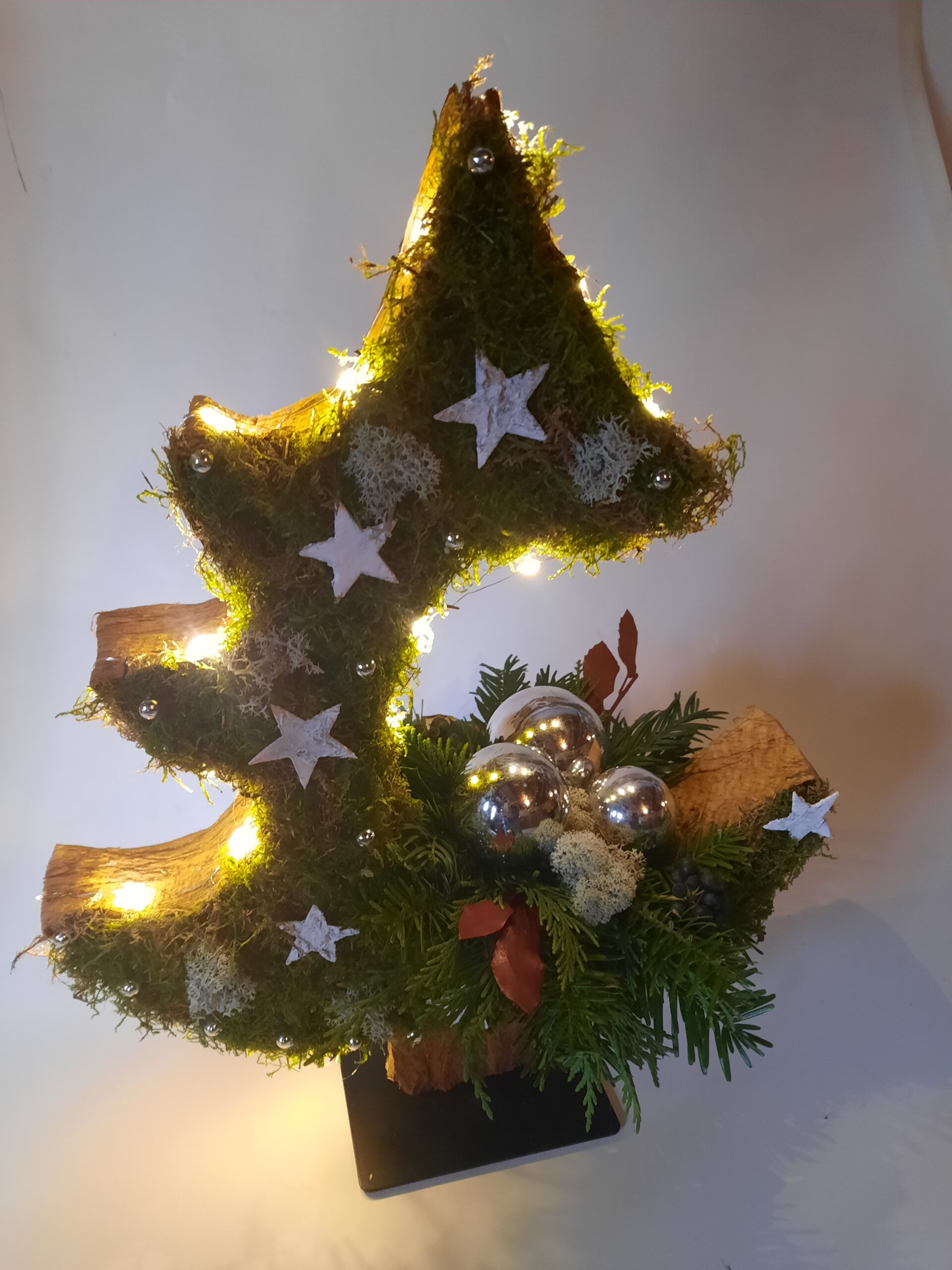 De open kerstboom maak je zelf op met mos en schors. Aan de buitenzijde van de open kerstboom komen lampjes.